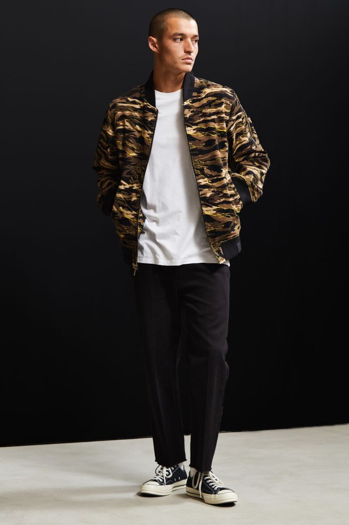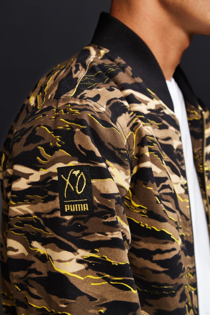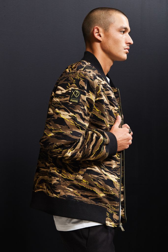 Camo print bomber jacket from puma's xo collection. Puma x xo bomber jacket; Centering around the theme of crafted military. Collaboration with the singer the weeknd. Stick graphics inside the jacket.